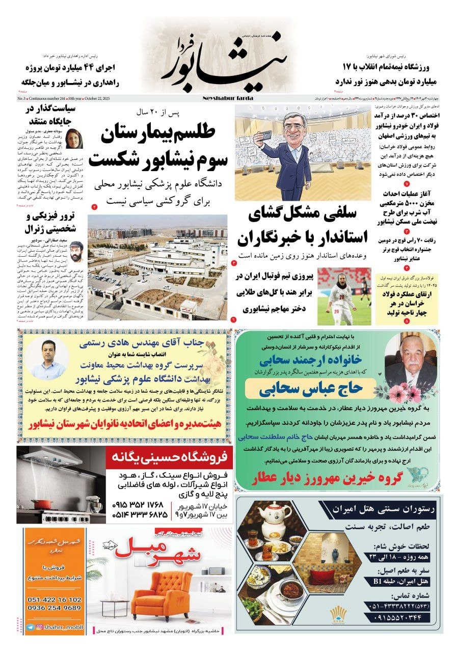 نیشابور فردا- پس از دو دهه انتظار، نیشابور سرانجام به نقطهای رسیده است که میتواند طلسم 20سالهاش را در حوزه درمان بشکند. بیمارستان سوم این شهر ـ که از زمان کلنگزنی تا امروز از دولت احمدینژاد تا دولت چهاردهم، میان وعدهها، توقفها و حوادث ملی و جهانی سرگردان بود ـ قرار است آبانماه امسال افتتاح شود.