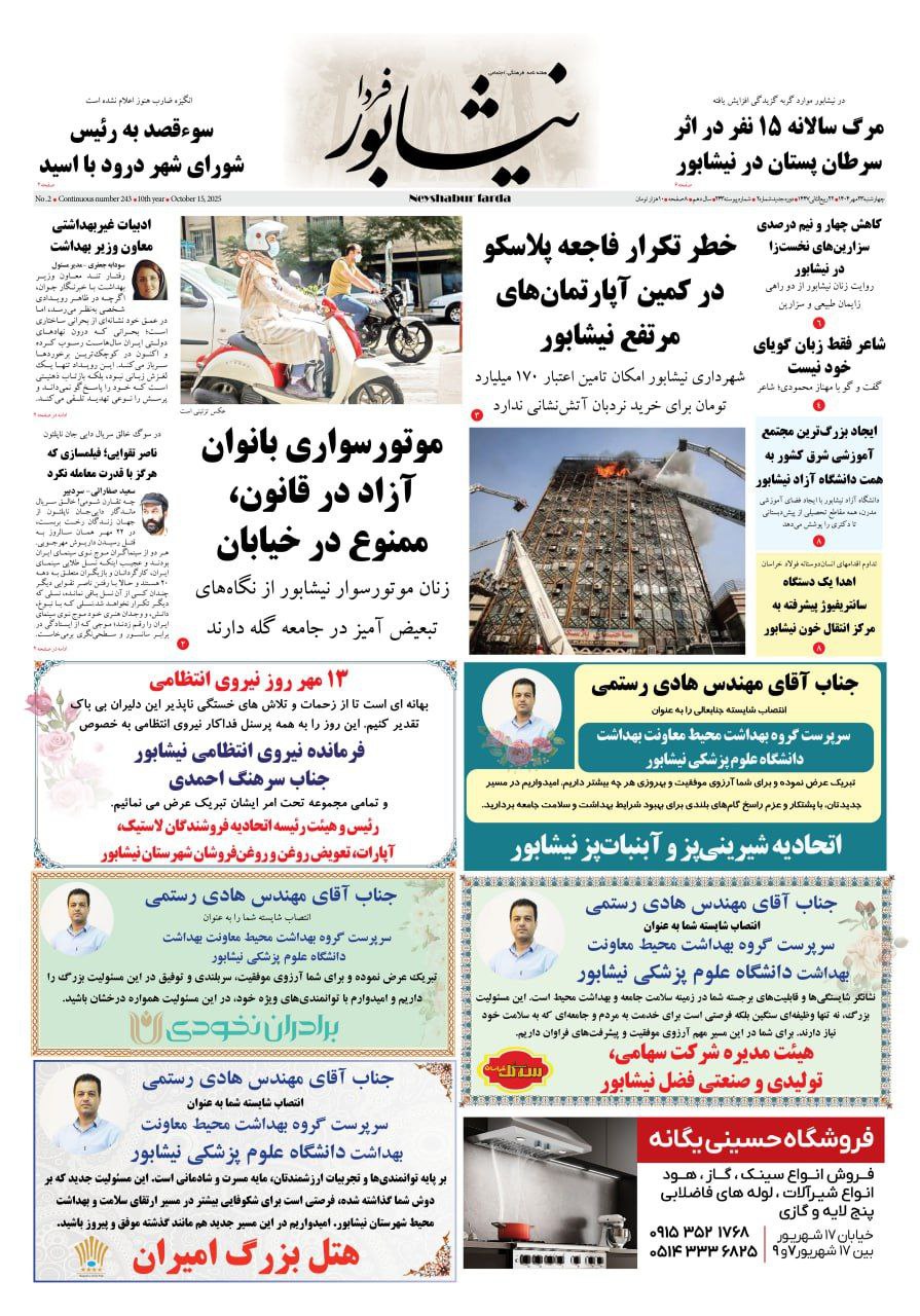 خطر تکرار فاجعه پلاسکو در کمین آپارتمان‌های مرتفع نیشابور ۲۴ مهر ۱۴۰۴